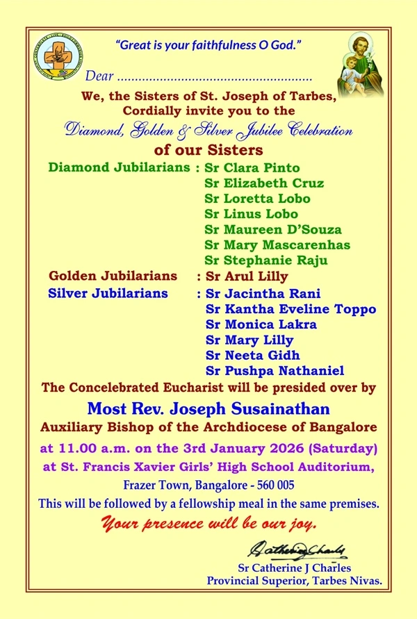 We celebrate the Diamond, Golden and Silver Jubilee of our Sisters. 3rd January 2026, is indeed a day of great rejoicing for us, the Sisters of St Joseph of Tarbes, as we celebrate the Diamond, Golden and Silver Jubilee of our Sisters. The Holy eucharistic celebration was presided by Most Rev Joseph Susainathan, The Auxiliary Bishop of the Archdiocese of Bangalore at 11 a.m in S.F.X auditorium, Fraser Town. News / by Tarbes Sisters